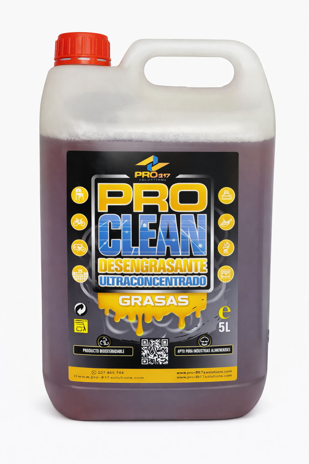 Desengrasante liquido multiusos para la limpieza y desengrase general de multitud de sustratos. Limpieza de campanas de extracción de humos, filtros de aire, suelos de terraza, gres, plaqueta, azulejos, cristales, mármol, plásticos, acero inoxidable, manchas de tinta, nicotina, motores, máquinas de vapor, etc.
